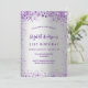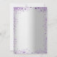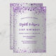 A girly and feminine 21st (or any age) birthday party invitation. On front: A trendy faux silver looking background. Decorated with dark purple and violet faux glitter, sparkles. Personalise and add a name, party details. The name is written with a hand lettered style script, purple coloured letters.