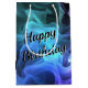 Neon iridescent smoke abstract pattern on black with Happy Birthday text.