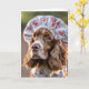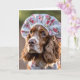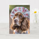 Brown and white springer spaniel dog wearing a floral print shower cap for a humourous birthday.