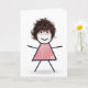 Cute stick girl with hair, red glasses, and gingham dress on a white background for sister's birthday.