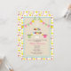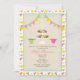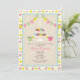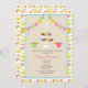 A birthday party invitation featuring a tea party theme. Invite has an illustration of a two tiered stand of French macarons at top with a pink and green teacup with lemon on either side. Personalise with age at top of stand. Invite also features solid and gingham bunting at top and a pink rose and lemon pattern background. Personalise the text with details of your occasion.