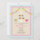 A birthday party invitation featuring a tea party theme. Invite has an illustration of a two tiered stand of French macarons at top with a pink and green teacup with lemon on either side. Personalise with age at top of stand. Invite also features solid and gingham bunting at top and a blue gingham background. Personalise the text with details of your occasion.
