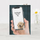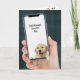Hand holding a golden retriever portrait with your text message on cell phone.