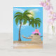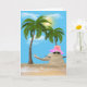 Cute tropical sandman wearing sunglasses and pink beach hat in sand with hammock and palm trees.