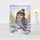 A charming owl wearing a winter hat with earflaps, perched on a pristine snow-covered branch, surrounded by a tranquil snowy forest that radiates peace and beauty in watercolor.