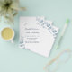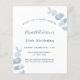 A white background, decorated with dusy blue eucalyptus stems, sprigs. Personalise and add a name and party details.