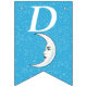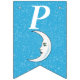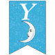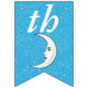 This flag shaped bunting Happy Birthday banner is bright aqua blue with a scattering of tiny white stars and a white crescent moon that has a face. Customise the birthday year with the templates.