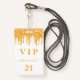 A modern, stylish and glamourous badge for a 21st (or any age) birthday party. A white background with faux gold glitter drip, paint dripping look. The name is written with a modern hand lettered style script with swashes. With the text: VIP Number 21 is written in a golden colour. To keep the swashes only delete the sample name, leave the spaces or emoji's in front and after the name.