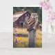 Owl on a fence post with wildflowers and an old barn for getting older birthday humour.