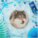 Photo of a wolf head. A friendly looking wolf with a smile on it's face. It's winter with a white snowy backdrop. Matching paper napkins for birthday parties available.