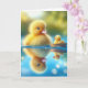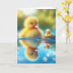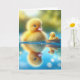A fluffy yellow duckling floats beside a tiny wooden boat holding an even smaller duckling, both surrounded by serene blue water and soft reflections.