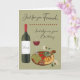 This is a birthday card for a friend with wine, charcuterie board including cheese, crackers, fruit and candy. The background is a linen soft green and the text, ‘Just for you Friend, Indulge on your Birthday.’