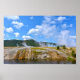 Steam rises from geothermal vents in a rocky landscape of Biscuit Basin adjoining the Firehole River in Yellowstone National Park, Wyoming, with a backdrop of lush green forest under a bright blue sky with fluffy clouds. Water from the hot springs and geysers constantly pours into the Firehole River. Biscuit Basin is an isolated thermal group of interesting geysers and hot springs and is part of the Upper Geyser Basin.