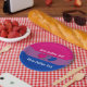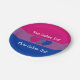 Paper plate with the bisexuality pride flag with little hearts in the centre of the design. Pink, purple, and blue flag of the bi pride movement; with an editable text field for your name or message