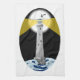 An illustration of Bishop Rock lighthouse. This lighthouse is on the Isles of Scilly of the Cornish Coast. The lighthouse is drawn at night, with a stormy sea and full moon.