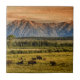 This photo features a herd of bison roaming free as the sun rises in front of the Grand Tetons.