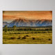 This photo features a herd of bison roaming free as the sun rises in front of the Grand Tetons.