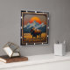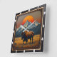 This illustration features a majestic bison walking through a field of tall grass. In the background, a striking mountain range is silhouetted against a large, stylised orange and red sun. The entire scene is framed by a dark, tooled leather border, giving it a powerful, rustic feel.