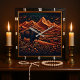 This illustration features a powerful bison standing in a field with a dramatic mountain range behind it. The artwork is rendered with a tooled texture and a striking colour palette of deep black and a glowing, copper-like orange. The scene is set at night under a starry sky with a large, glowing moon or celestial body, giving it a mystical feel.