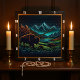 This illustration depicts a family of bison, with a large one leading two smaller calves through a field at night. The artwork has a dark, tooled, neon colour background with glowing mountains and a river. The entire scene is rendered in a mix of dark tones and vibrant neon green and orange to create a mystical, unique atmosphere.