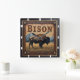 This illustration features a dark, tooled leather background with a majestic bison or buffalo in a field. A mountain range is visible behind it, bathed in the warm, earthy glow of a sunset. The bottom of the artwork includes the text "BISON".