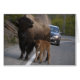 Adult Bison with its calf blocking traffic in Yellowstone National Park