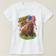 American Buffalo Bison in the orange and black text. An American bison buffalo grazing on grass with the American flag displayed in the background.