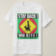 Silhouette of a woman walking a dog on the yellow caution sign background. Text: :Stay Back! Will Bite! ...and dog ain't so friendly either!"