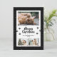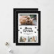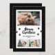 Modern black photo Meowy Christmas card featuring three photos, snow and paw prints on the front and a snowy background at the back. Easily personalize this cute photo Christmas card with your photos, family name and the year.