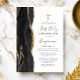 The left-hand edge of this elegant modern first communion invitation features a black watercolor agate border trimmed with faux gold glitter. A faux gold foil cross appears above the customizable text, which combines handwriting, copperplate and italic fonts in charcoal gray on a white background. The reverse side features a matching black and gold agate design.