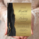 The left-hand edge of this elegant modern wedding invitation features a black watercolor agate border trimmed with faux gold glitter. The customizable text combines off-black handwriting, copperplate and italic fonts on a gold ombre faux foil background. The reverse side features a matching black and gold agate design.