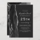 The left-hand edge of this elegant modern wedding anniversary party invitation features a black watercolor agate border trimmed with silver faux glitter. The customizable text combines silver gray handwriting, copperplate and italic fonts on a slate black background. The reverse side features a matching black and silver agate design.