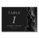 The right-hand edge of this elegant modern wedding table number card features a black watercolor agate border trimmed with faux silver glitter. The customisable text combines silver grey Roman serif, italic and copperplate fonts on an off-black background.