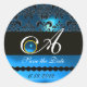 BLACK AND BLUE SAPPHIRE DAMASK MONOGRAM, CLASSIC ROUND STICKER