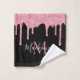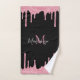 Trendy Pink Rose Gold Glitter Sparkle Drips Bath Towel Set featuring your custom name and monogram on a background of girly faux glitter drips on a chic black background. Perfect for your glitter aesthetic. Designed by Cedar and String. If you need assistance or matching items, please contact us at cedarandstring@gmail.com