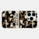 Customise this black and brown camouflage iPhone 16 pro case with your name in a trendy modern CAP font in black on cream. It's masculine and perfect for your favourite military, hunting, country or outdoorsman!