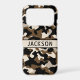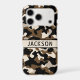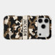 Customize this black and brown camouflage iPhone 17 pro case with your name in a trendy modern CAP font in black on cream. It's masculine and perfect for your favorite military, hunting, country or outdoorsman!