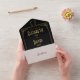 This chic black and gold 1920s art deco all-in-one wedding invitation features elegant typography and monogram initials. The invitation includes a perforated RSVP card that can be individually addressed or left blank so you can handwrite your guest's address details. Designed by Thisisnotme©