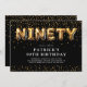 Modern 90th birthday invitation featuring a stylish black background, a scattering of gold glitter confetti, gold hellium balloons that spell "ninety", and a elegant party text template that is easy to personalise.