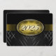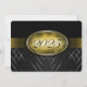 Black and gold graduation invitation with light and dark black stripes and a gold ribbon going across showing the year of graduation. The back of the card is black with light gold font for people to fill in the graduation party invitations.