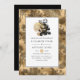 Wedding invitation featuring black and gold roses and a shimmering faux foil vintage damask background.