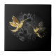 Black and gold jewellery hummingbirds on grey background decorated with plants. Jewellery birds. Golden bird. Gold bird.