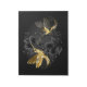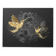 Black and gold jewellery hummingbirds on grey background decorated with plants. Jewellery birds. Golden bird. Gold bird.