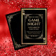 This Game Night party invitation features a classic playing card design on a black background. An ornate, vintage style frame surrounds the centre text area. A matching gold foil design frame borders the invitation. Two gold diamonds and the King monogram are printed in opposite corners, similar to the layout in a deck of cards.