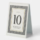 Set the tone for a modern wedding where the guests wear black and white, the reception is at a jazz club with art deco, speak easy vibes, and everyone drinks Negronis and dry martinis while swaying to the music of a jazz band. Inspired by the timeless chequerboard patterned floors that have appeared in architecture since the first century, the black and white check motif has popped up over and over again through the ages. Turned forty five degrees and used as a frame, this motif feels upscale and fashion forward. This event table number sign is durable for multiple events and features multiple areas of custom text.