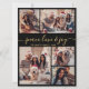 Minimalist Modern Black and Gold 5 Photo Collage "Peace, Love, and Joy" Christmas Card. This elegant holiday card features a 5-photo collage on the front and one additional photo on the back. The "Peace, Love, and Joy" message is beautifully hand-lettered in (faux) gold calligraphy on a sleek black background, adding a touch of sophistication to your holiday greetings. The back side includes a customisable greeting template with a heart doodle motif and space for one more photo. Perfect for sharing holiday memories with family and friends, this personalised card brings festive joy to the Christmas season.