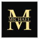 featuring personalised gold monogram in classic serif font style with box of name in the middle of monogram on black background.