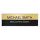 This name tag features name and title in modern sans serif font style on black and gold background.
