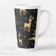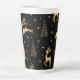 Elegant gold reindeer surrounded by stylised gold Christmas trees, gold snowflakes, and white stars on a black background.