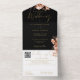 All-in-one wedding invitation featuring elegant gold typography on a black background. The invitation includes a perforated RSVP card with your wedding website QR code and details. Designed by Thisisnotme©